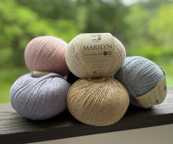 Marilyn is a delicate and decadent organic cotton blend, featuring fashionable sequins for added sparkle. Perfect for lightweight shawls & tops, Marilyn is machine washable and comes in oversized 503-yard balls.
