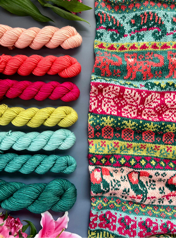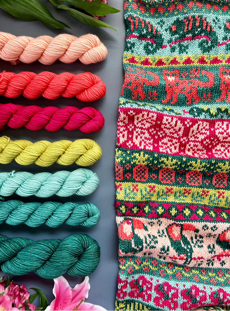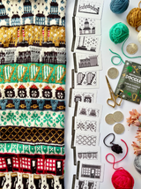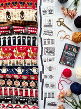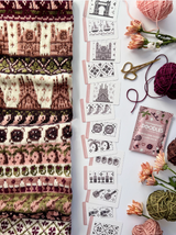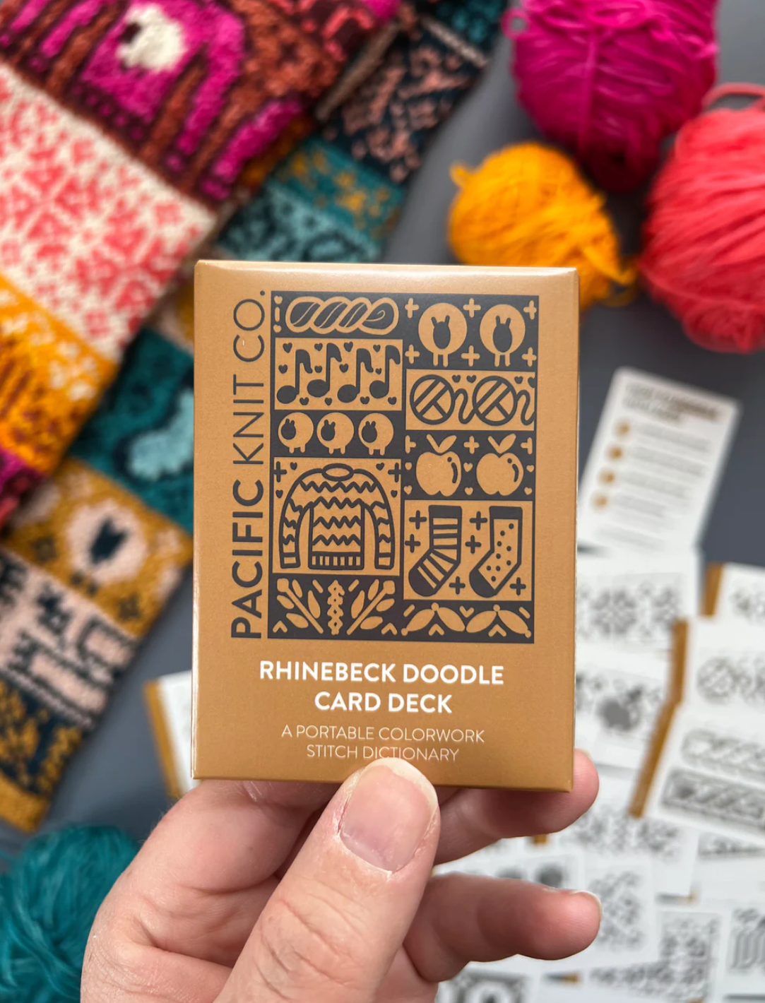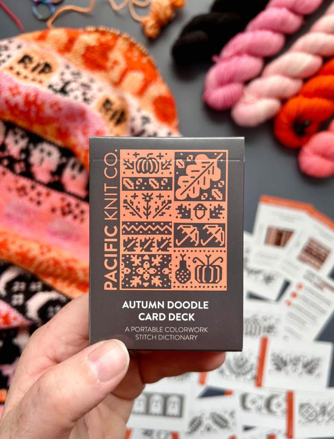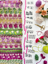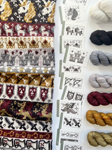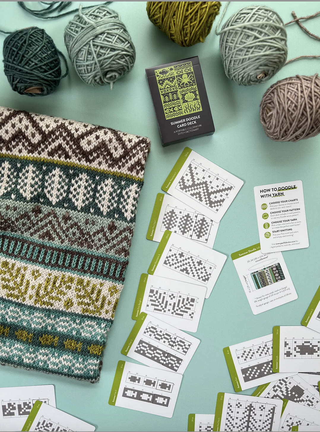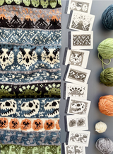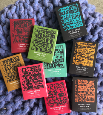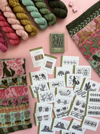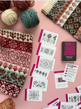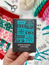 Each of the Expansion Doodle Decks includes 24 unique colorwork charts, 2 cowl patterns, and an instruction card, all wrapped up a custom printed cardboard tuck box.