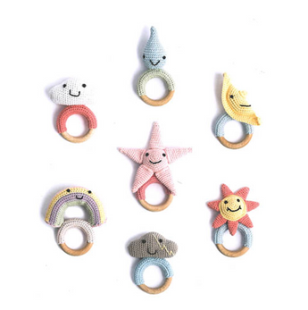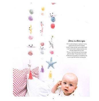 Crochet cute teething rings and cot mobiles for babies in amigurumi style using lovely 25g skeins of our popular cotton yarn, Ricorumi. The sun, moon, and stars, little clouds, cute raindrops, and cheerful rainbows all make an appearance in the In The Sky collection, made up of seven teething rings and a lovely mobile with wonderul celestial figures.