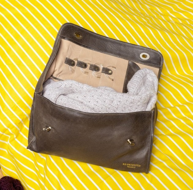 The Project 73 bag is thoughtfully designed for knitters who value organization and style. The lid features a convenient section to securely store your circular needles, ensuring they’re always within reach. Inside, the spacious main compartment provides ample room for multiple knitting projects, yarns, and accessories.