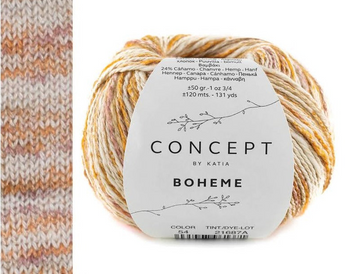 Boheme is a slub effect cotton & hemp blend yarn. Hemp is a natural and biodegradable fiber which has been used fin fabrics for centuries. It adds a rustic but soft touch to this yarn. Available in various colors with a cream base. Ideal for warm weather knitting and wearing!