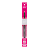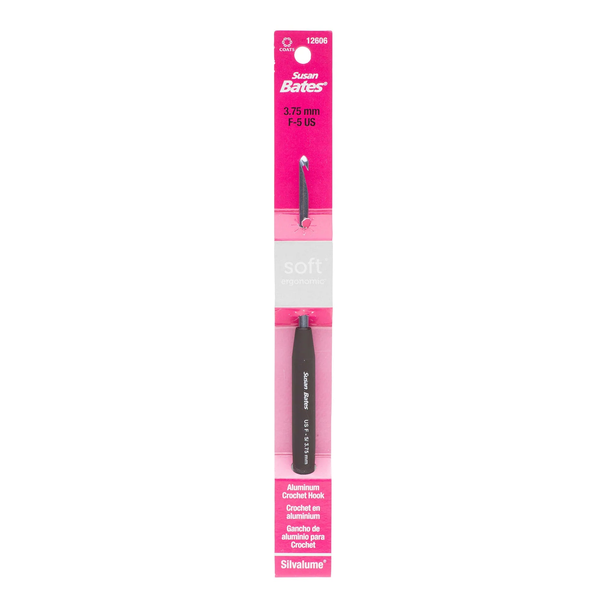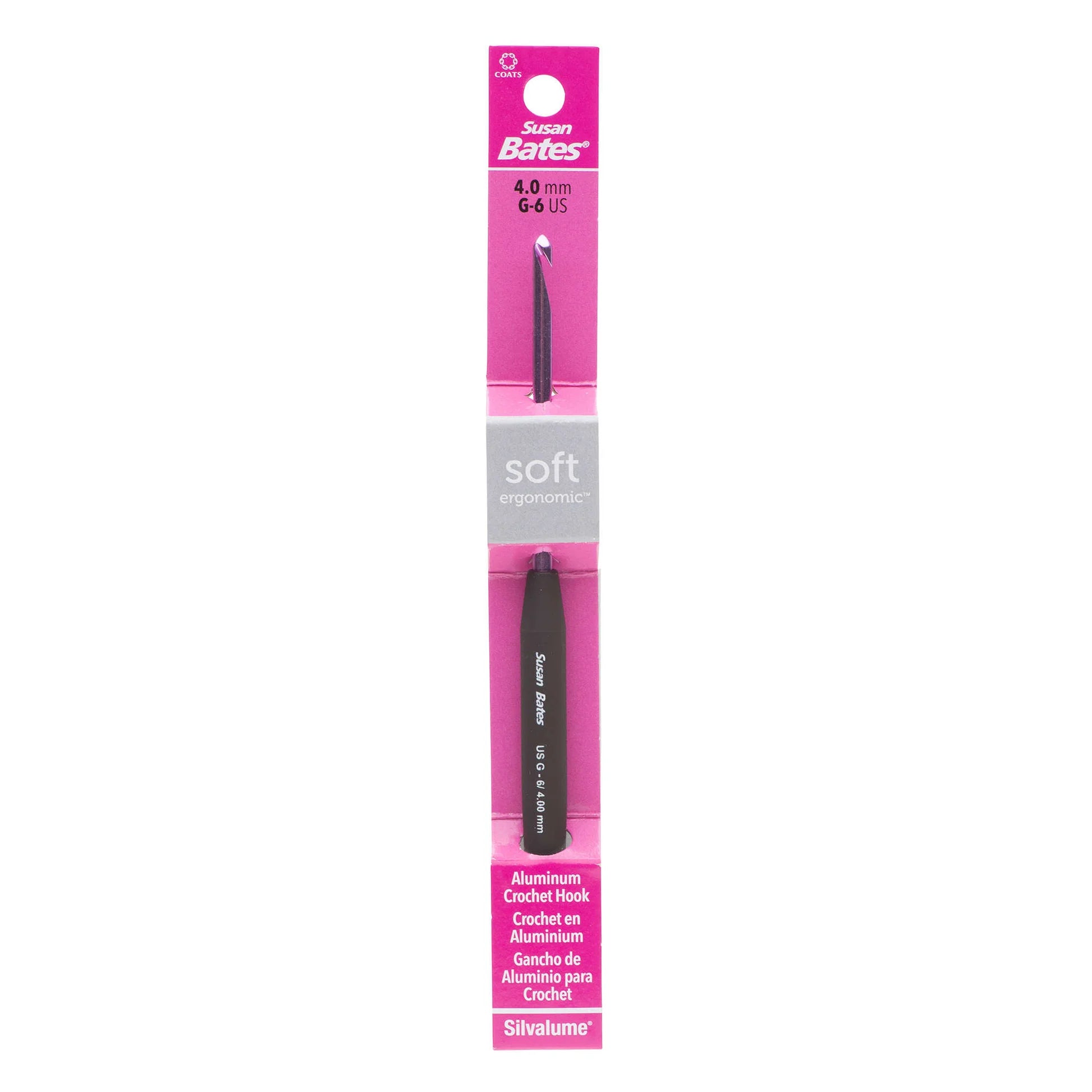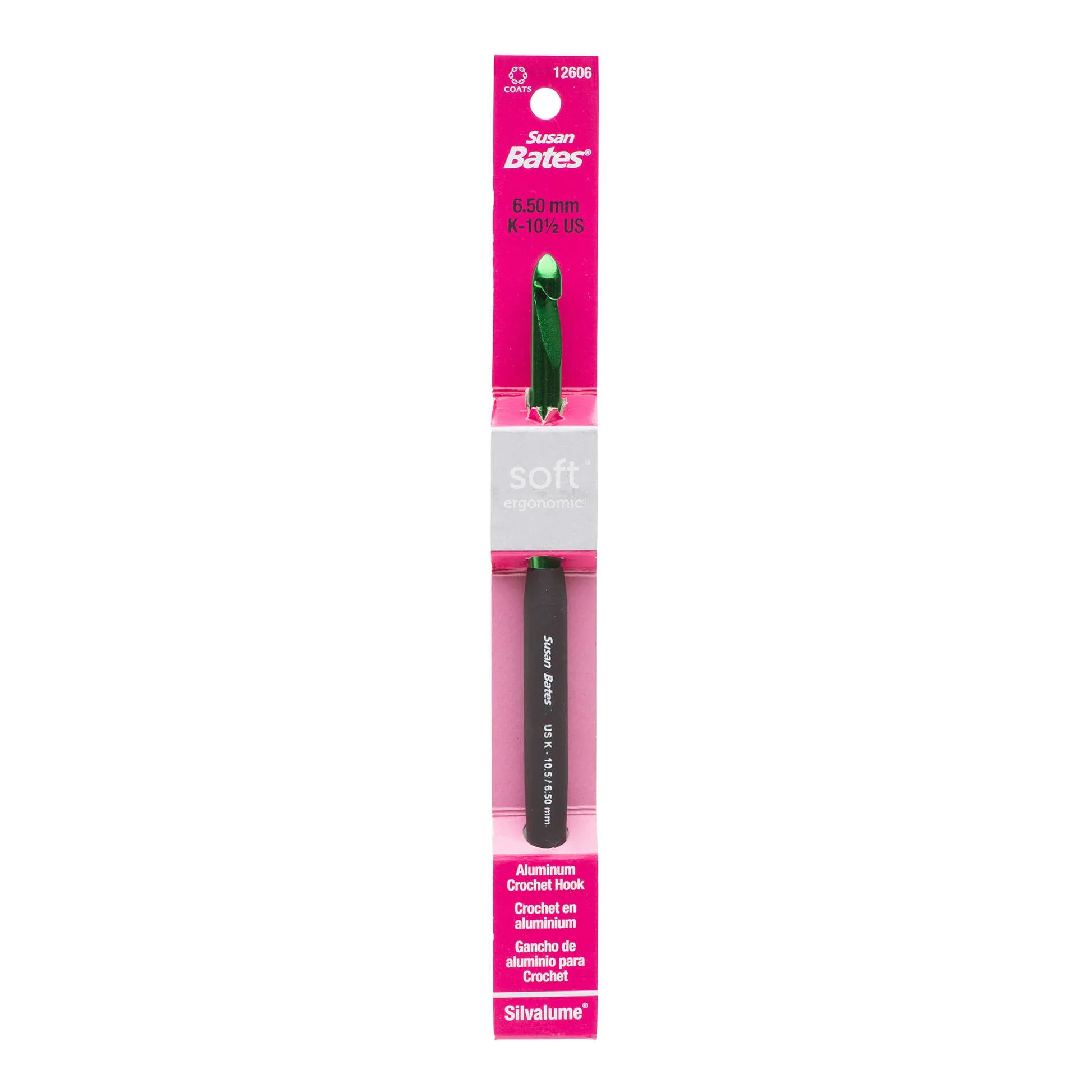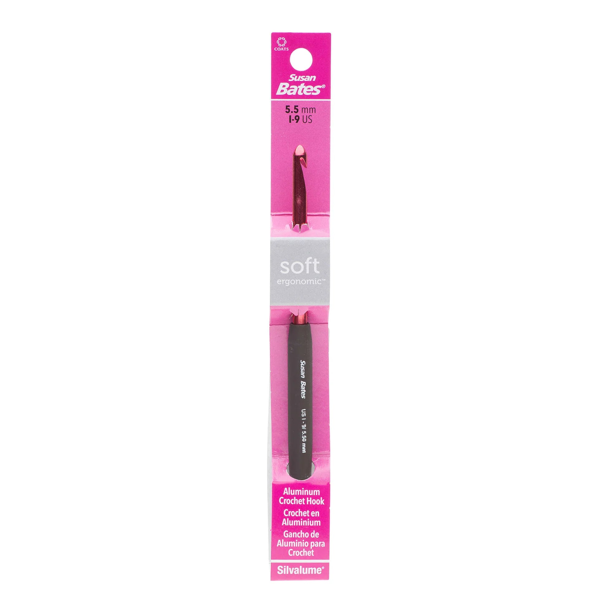 Aluminum Susan Bates in-line hook head for uniform stitches and reduced wrist strain. This crochet hook has a velvety smooth ergonomic handle. This package contains one 5.5 inch long crochet hook. Comes in a variety of sizes. Each sold separately. Imported.